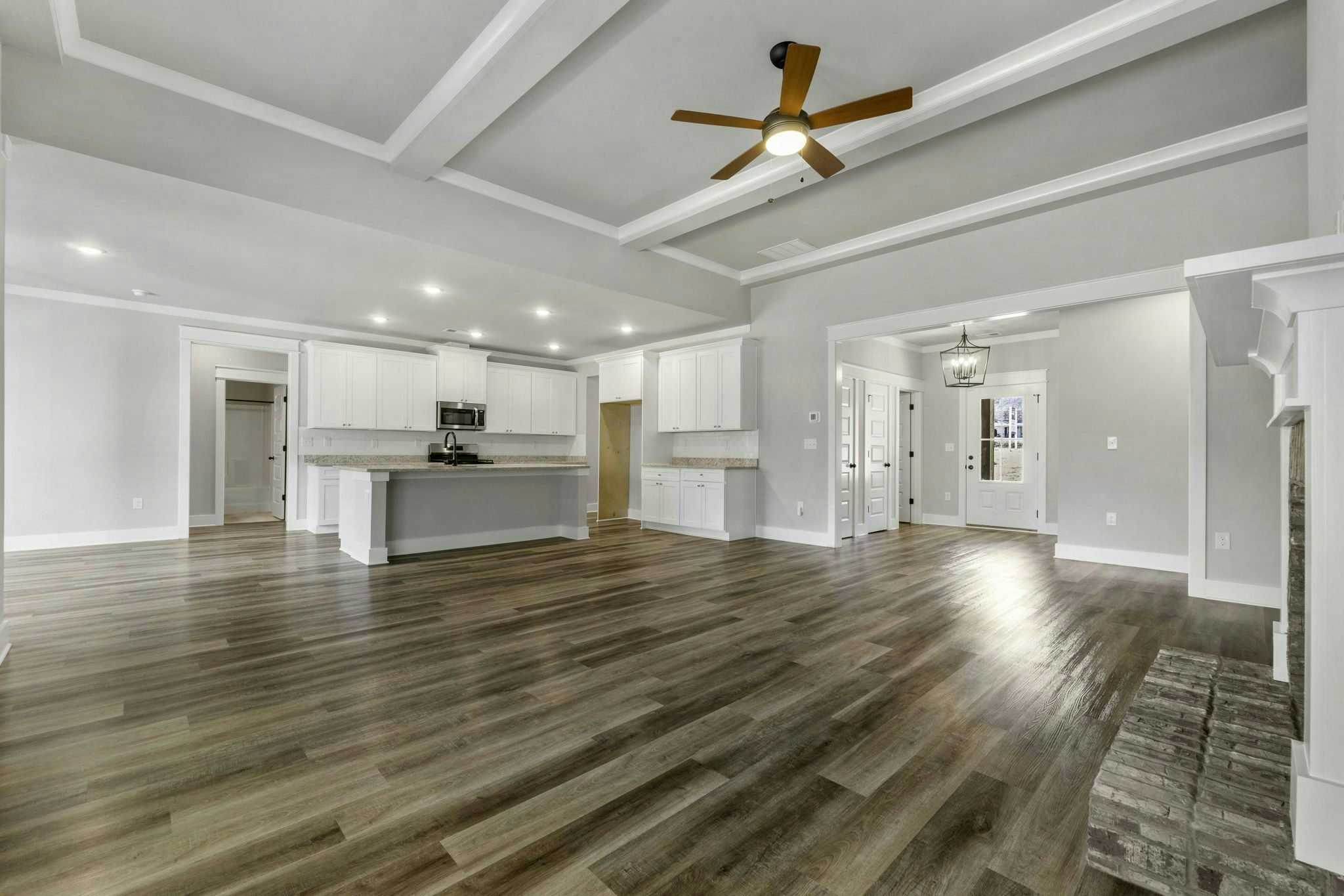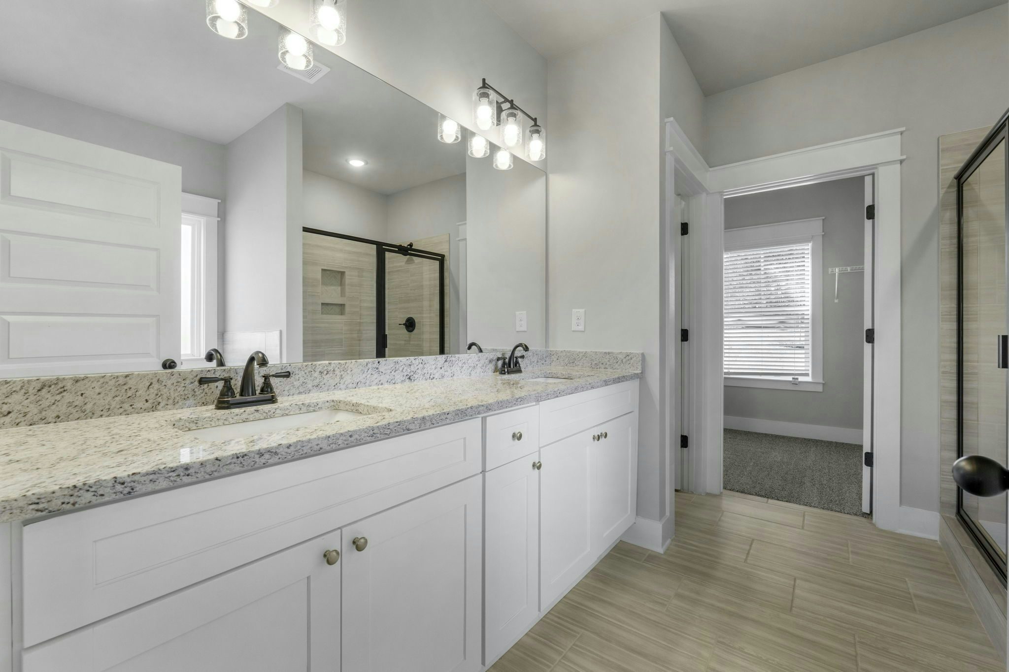 Farmhouse style exteriors, Ranch floor plans, Fiber cement siding, Architectural shingles (30 year warranty), Professionally landscaped yards, Large covered back patios (on slabs), 9’ ceilings, Trey or vaulted ceilings (per plan), Craftsman trim package, Ceiling fans in Owner’s Retreat and great room, Fans pre-wired in secondary bedrooms, Solid surface flooring through living areas, kitchen, laundry, and half bathrooms, Tile in master bathroom, Granite countertops throughout, Stainless steel appliances, Soft close cabinets throughout, Spacious Owner’s retreat, Garden tub & separate tile shower in Owner’s retreat (plan specific), Oversized walk-in closet in Owner’s retreat, Wireless security system, HVAC dual system with sealed ducts for energy efficiency, Video doorbell, Programable Digital Thermostat , Pre-closing home orientation, One year Chisel Mill exclusive in-house warranty, 2-10 structural extended warranty by 2-10 Warranty Corporation, Transferable termite bond